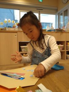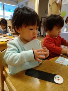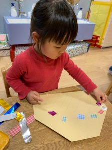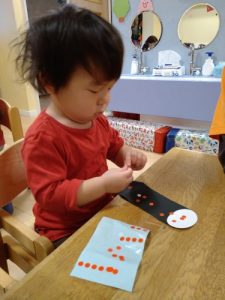 1歳児クラスは、恵方巻にみたてて、シールをペタペタ!
