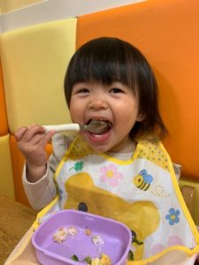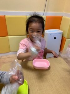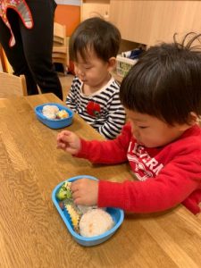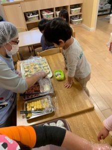 早くお弁当箱に詰めてもらいたくてうずうずしている子どもたち( *´艸`)