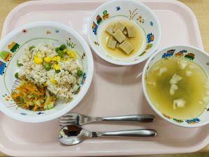 ツナコーンチャーハン 味噌汁 高野豆腐の煮物 ブロッコリーの塩茹で