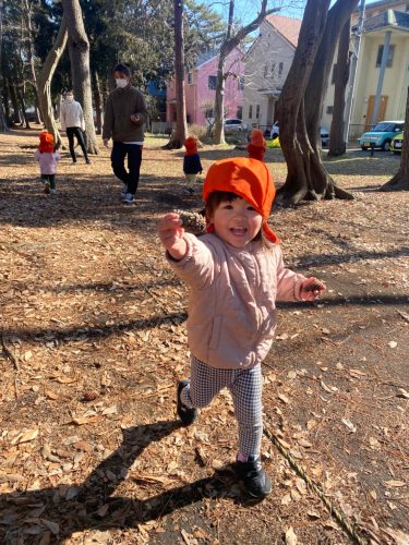 今まで散歩車に座ってお散歩に行っていたもも組さんも、来年度の新しいお友だちが来ると散歩車を卒業となるので、あんよでお散歩に行く練習を始めます?