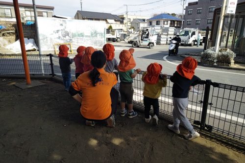 公園の隣の工場では、働く車も動いていて、みんなで釘づけ?