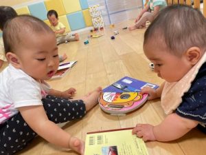 お姉さんが絵本を渡してくれて、気になっているもも組さん?