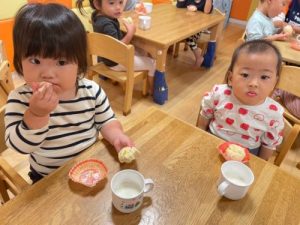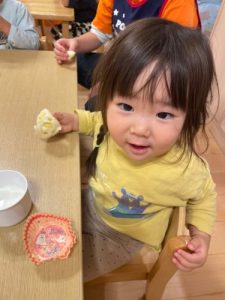 お誕生日会メニューのおやつは、チーズ蒸しパン✨10月ということでハロウィン🎃仕様になっていました💖