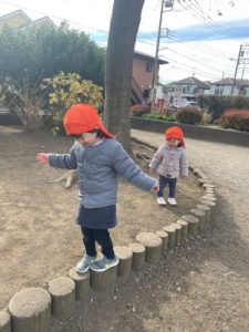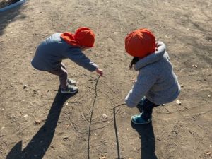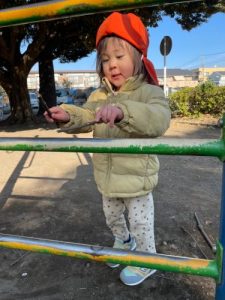 遊具を小枝でたたいて楽器演奏を楽しんでいました♫