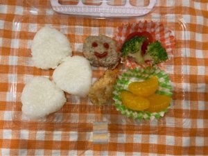 ハンバーグくん、エビフライちゃん(ささみと人参でできたエビフライ風おかず)、ブロッコリーくん、トマトちゃん