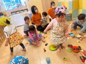 雨の日は、おままごとをしながらみんなでエプロンやバンダナで変身してごっこ遊びも楽しみました♫