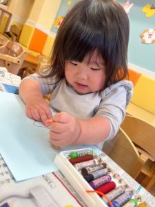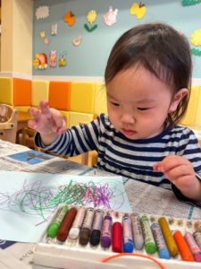 もも組さんも、保育士と一緒に初めてのクレヨン💖🖍