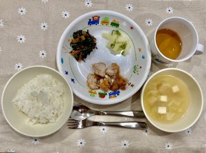 (写真は普通食になります。年齢によって盛り付け量を変えて、提供しています。)