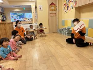 今週は、みんなが大好きな絵本、だるまさんシリーズの「だるまさんが」の読み聞かせをしている時のお写真です❣️