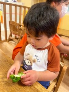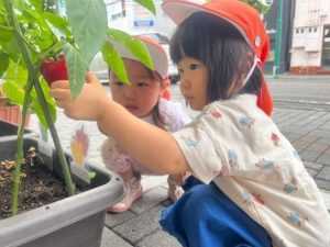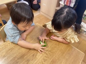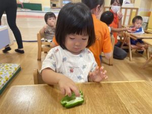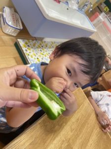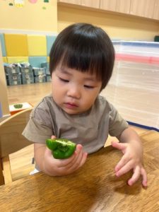 ピーマンは苦味があって苦手なお子さんが多い野菜ですが、食育として『野菜の実物に触って興味関心を広げる』と、少し苦手意識が変わってくるかもしれませんね✨