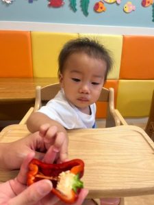りんご組さんは、栄養士の先生に『パプリカは目にいい栄養が入っているんだよ✨』『中にはタネが入っているね!』と話を聞きながら知識を深めていました🫑