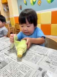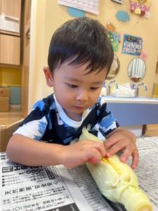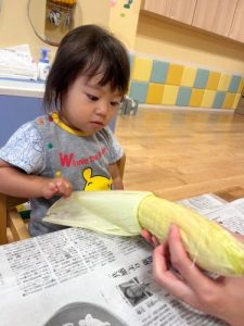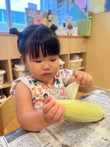8月の食育では、とうもろこしの皮むきを行ないました✨