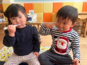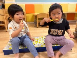 サンライズキッズ保育園では、この絵本に登場するお友だちの様に、2歳児のお友だちが給食後に上手に歯磨きを頑張ってくれています✨