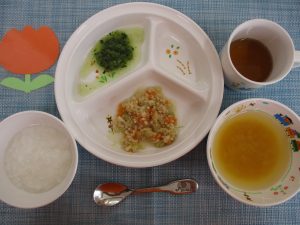 (写真は離乳食中期です。年齢によって形、固さ、盛り付け量を変えて提供しています。)