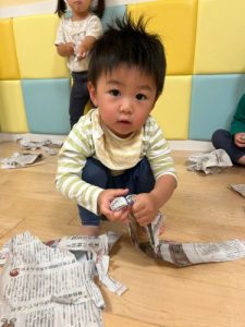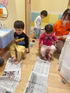 足を使って新聞紙の巻き取りかけっこもやってみました🎶🦶