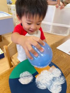 十五夜製作では、風船スタンプをしたり…
