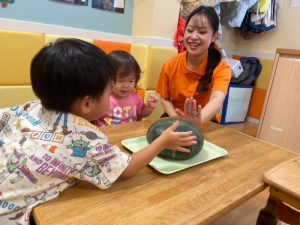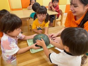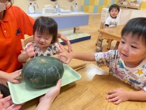 そして、もうひとつ、とっても大盛り上がりだったのが【食育 かぼちゃに触れてみよう】🎃でした🎶