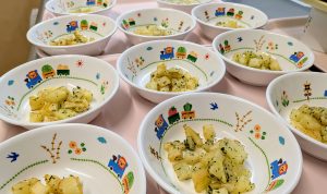 (写真は離乳食後期です。年齢によって形、固さ、盛り付け量を変えて、提供しています。)