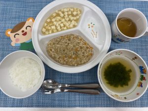 (写真は離乳食後期です。年齢によって形、固さ、盛り付け量を変えて、提供しています。)