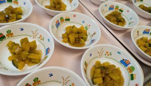 (写真は離乳食後期です。年齢によって形、固さ、盛り付け量を変えて、提供しています。)