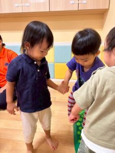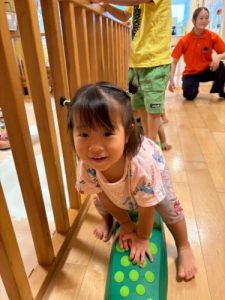 平均台を渡るお友だちを、横から手を繋いでフォローする2歳児の子どもたちの姿も見られました🥰