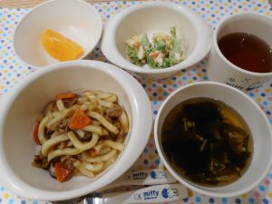 ☆11月7日(火)☆ ・カレーうどん ・すまし汁 ・ブロッコリーと卵のサラダ ・オレンジ