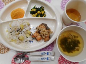 ☆11月17日(金)☆ ・さつま芋ご飯 ・すまし汁 ・鮭の味噌マヨ焼き ・ほうれん草のコーンのソテー...