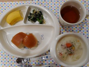 ☆11月13日(月)☆ ・ロールパン ・クリームシチュー ・ほうれん草の胡麻和え ・バナナ