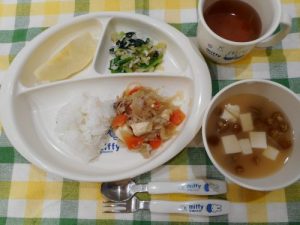 ☆3月8日(木)☆ ・ご飯 ・さつま芋の味噌汁 ・高野豆腐の卵とじ ・すみそあえ ・りんご