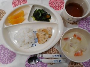 ☆3月13日(火)☆ ・ご飯 ・白身魚のムニエル ・クリームシチュー ・ドレッシングあえ ・伊予柑
