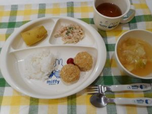 ☆1月23日(火) ・ご飯 ・キャベツと油揚げの味噌汁 ・コロッケ ・ツナのあえもの ・バナナ
