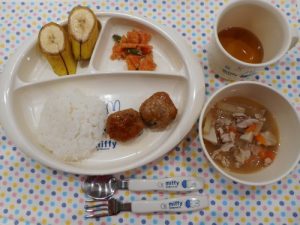 ・ご飯 ・みそ汁 ・鶏肉のピカタ ・胡瓜としらすの和え物 ・バナナ