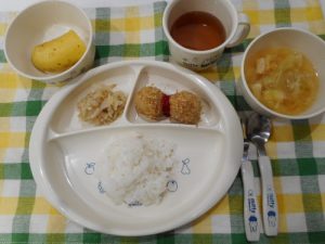 ☆1月9日(火)☆ ・ご飯 ・キャベツと油揚げの味噌汁 ・コロッケ ・ツナのあえもの ・バナナ