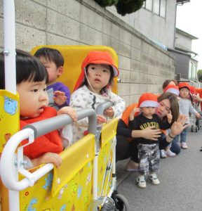 先生と一緒に手を繋いだり、お散歩車に乗って、