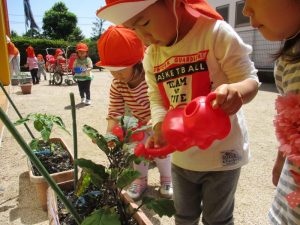 みんなで育てているピーマン・なすび・トマトがどんどん成長していますよ
