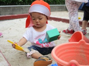 型や容器に砂を入れてひっくり返したり足にかけたりしてじっくりと遊んでいました♪