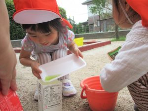 今回は草や葉っぱでの色水でしたが、木の実やお花などを使って色々な色水を作って遊びたいと