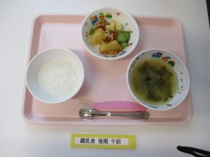 2018.07.10|給食ピックアップ 7月10日(火)お給食 ★幼児食★ ・ごはん ・玉ねぎとわかめの味噌汁 ・キュウリのゆかり和え ・煮物 ・魚の照り焼き ★離乳食★ ・おかゆ ・味噌汁 ・魚の照り煮 ・じゃが芋の煮物 ・ゆで野菜 前へ 次へ