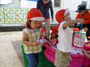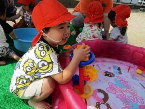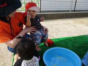 りんご組さんといちご組さんは、プールやたらいに少しだけ水を張り、