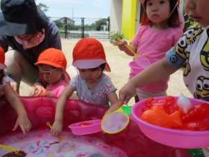 浮かべてあるお魚やあひる、ボールをお皿にすくってとっても楽しそうです♪