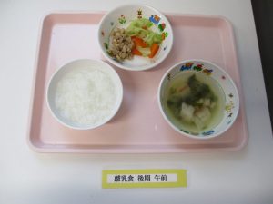 2018.07.14|給食ピックアップ 7月14日(土)お給食 ★幼児食★ ・ごはん ・焼麩の味噌汁 ・チキンソテー ・野菜の胡麻和え ・みかん缶 ★離乳食★ ・おかゆ ・味噌汁 ・ゆで野菜 ・そぼろ煮 前へ 次へ