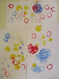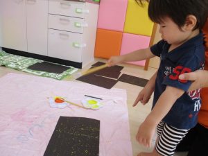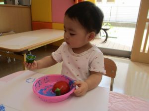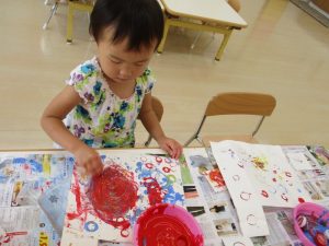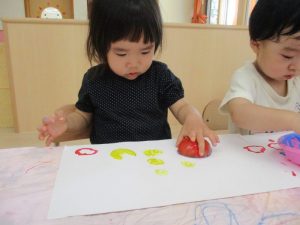 丸の形が上手に紙にうつると、とっても嬉しそうに声を上げるりんご組さん♡