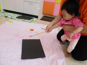 いちご組さんは、筆に絵の具をたっぷりつけて、『パッ』と振り下ろし、