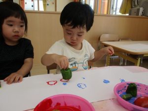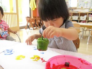 園庭で実ったお野菜を使っての『野菜スタンプ』にも挑戦しました。