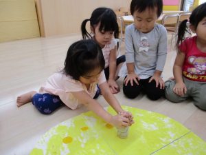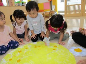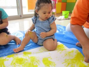 もも組さんといちご組さんは手に絵の具を塗ってペタペタと