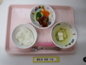 2018.09.29|給食ピックアップ 9月29日(土)お給食 ★幼児食★ ・ご飯 ・豆腐とわかめのみそ汁 ・お月見バーグ ・炒めビーフン ・きゅうりのポリポリ ★離乳食★ ・軟飯 ・豆腐とわかめのみそ汁 ・お月見バーグ ・炒めビーフン ・きゅうりのポリポリ 前へ 次へ