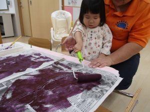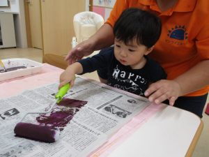 ローラーに紫の絵の具をつけてコロコロと新聞紙の上を
