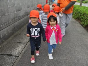 お友だちと手をつないで歩いているりんごぐみさん!日に日に歩くことが上手になっています?