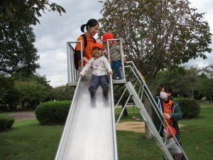 公園では、保育士に見守られながら「シュ~ッ‼」と滑り台をしたり