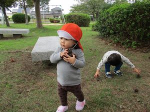 保育士や友だちとかけっこをしたり、まつぼっくり拾いをして楽しみました(*^^)v